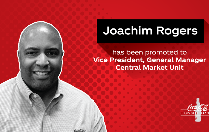 Coca-Cola Consolidated is pleased to announce the promotion of Joachim Rogers to Vice President, General Manager Central Market Unit. Rogers brings years of extensive sales experience to the role and will position Coke Consolidated to deliver strong results and drive continued growth.